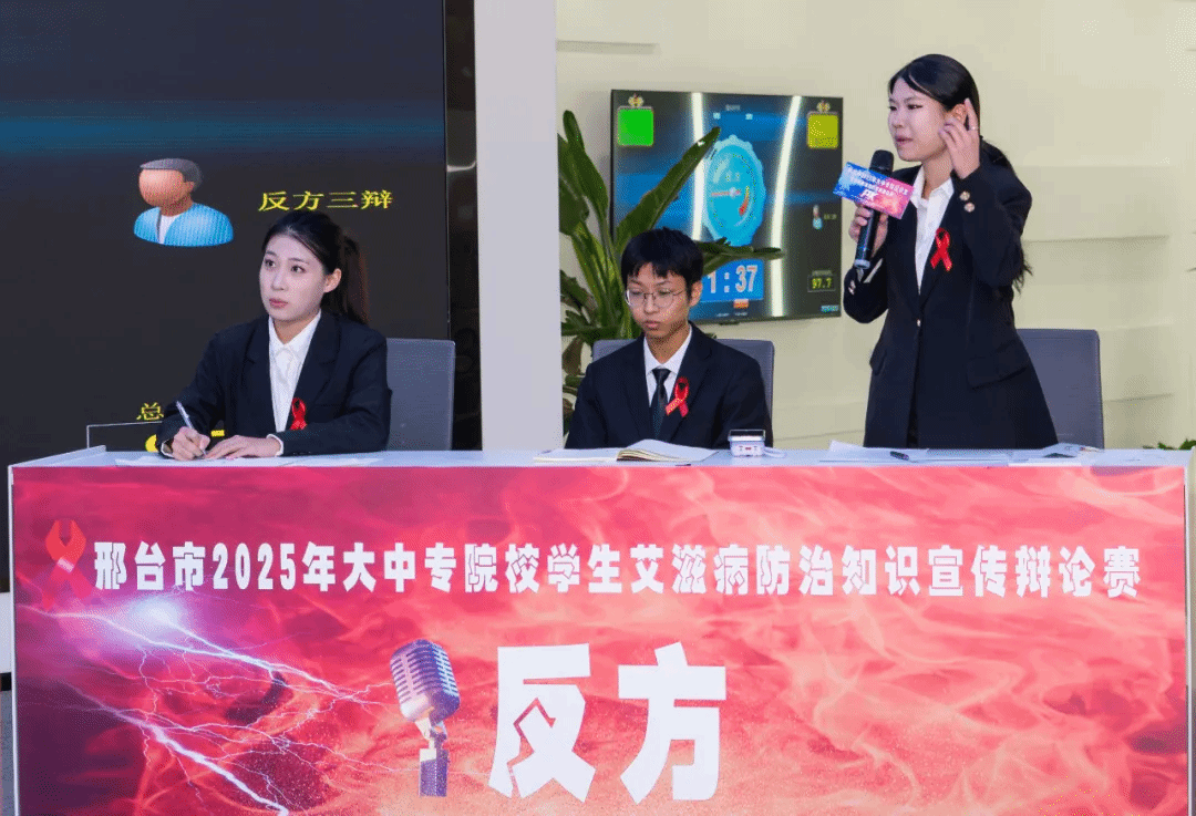 近日,由市卫健委、市教育局、共青团市委、市计生协联合主办的邢台市2025年大中专院校艾滋病防治知识宣传辩论赛总决赛在邢台学院圆满落幕,我校2024级影像本科班谢子瑶、2025级康复治疗学本科3班赵士雄、2024级药学本科2班于欢欢组成的代表队荣获一等奖。