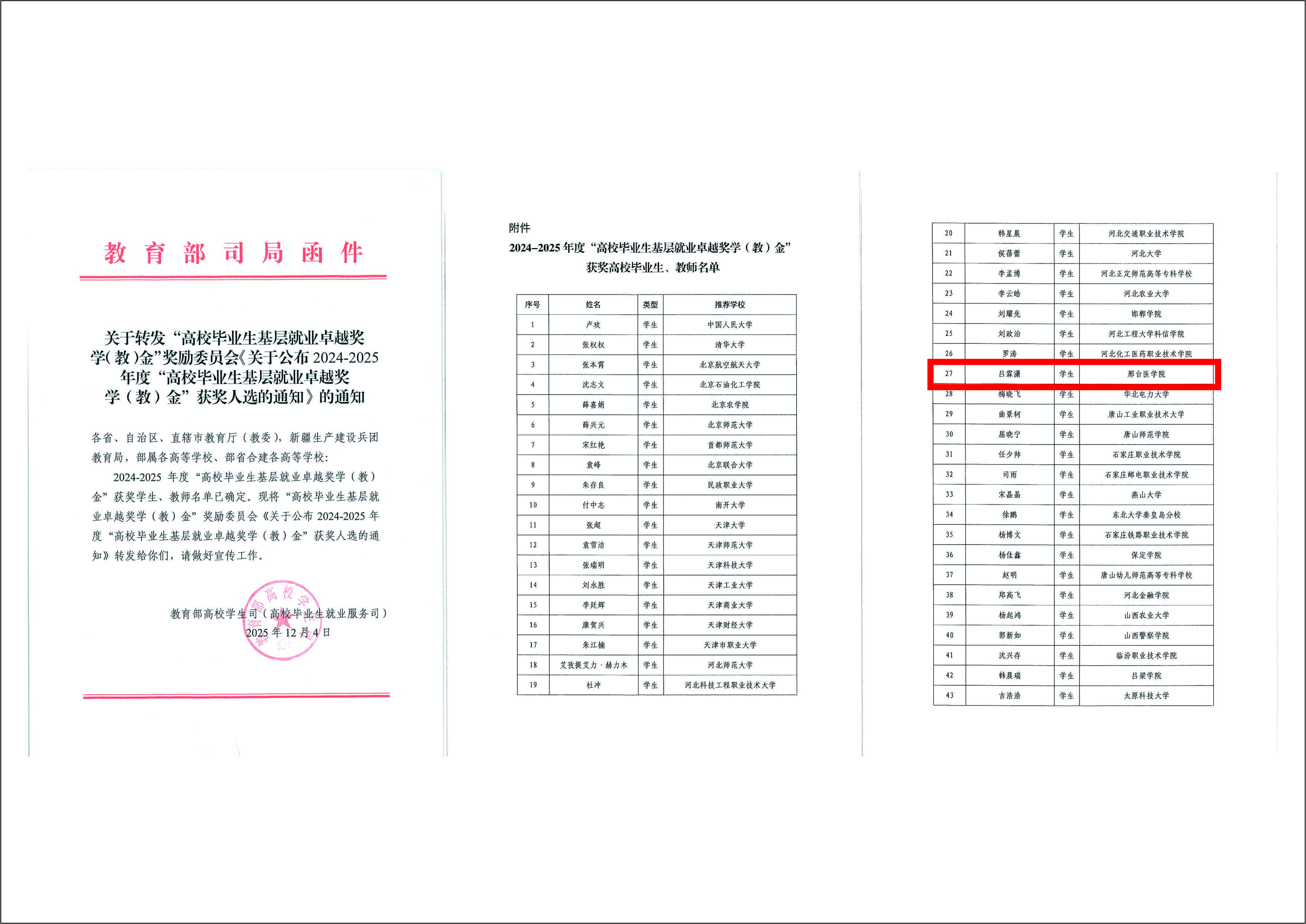 近日,教育部公布了2024-2025年度“高校毕业生基层就业卓越奖学(教)金”获奖人选,我校2019届临床医学专业毕业生吕霖潇入选。本年度全国共表彰418名毕业生,其中河北省仅21名毕业生获此殊荣。