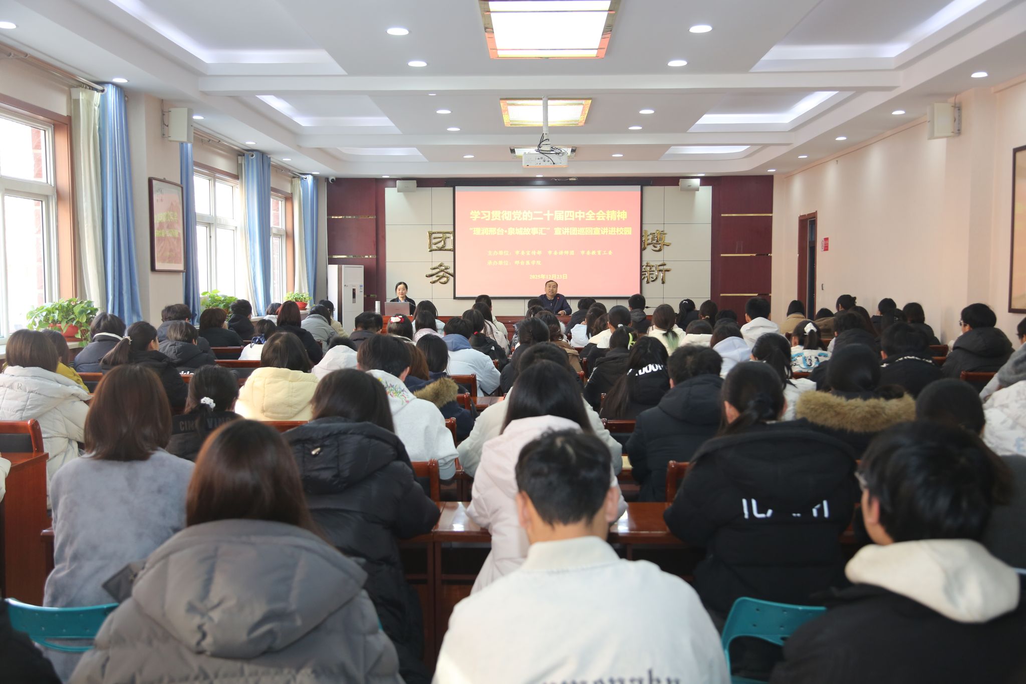12月23日,由市委宣传部、市委讲师团、市委教育工委主办,我校承办的“理润邢台·泉城故事汇”巡回宣讲活动在图北会议中心举行,市委宣传部有关负责同志、临床医学系、中医系、口腔医学系、医疗技术系学生代表100余人参加,组织宣传统战部副部长姜桂勇主持。