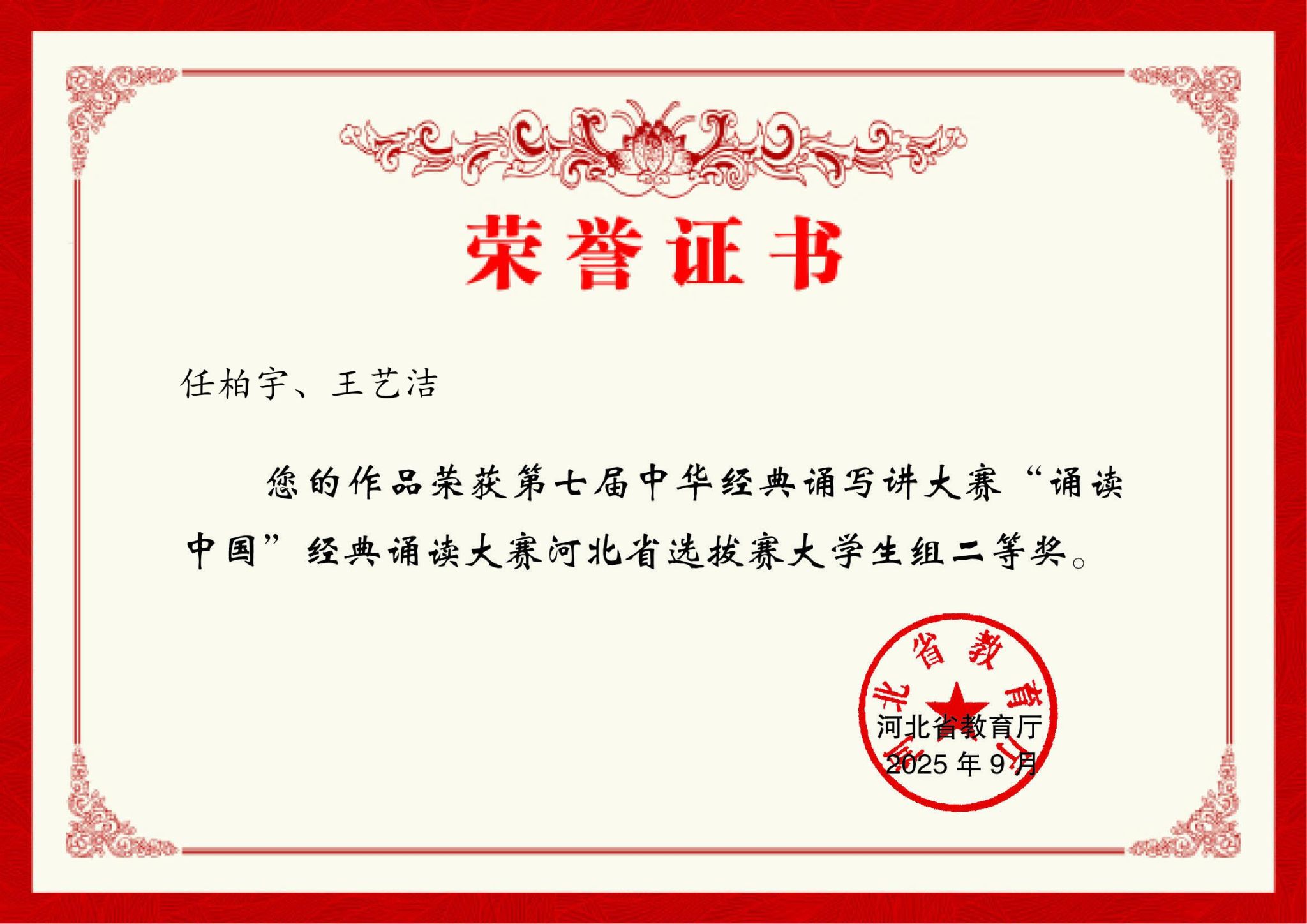 近日,第七届中华经典诵写讲大赛获奖名单公布,我校学生在比赛中表现优异。2024级装备1班任柏宇、2024级临床7班王艺洁同学的作品《土地的誓言》荣获全国优秀奖。4名师生荣获省赛二等奖1项、三等奖2项。