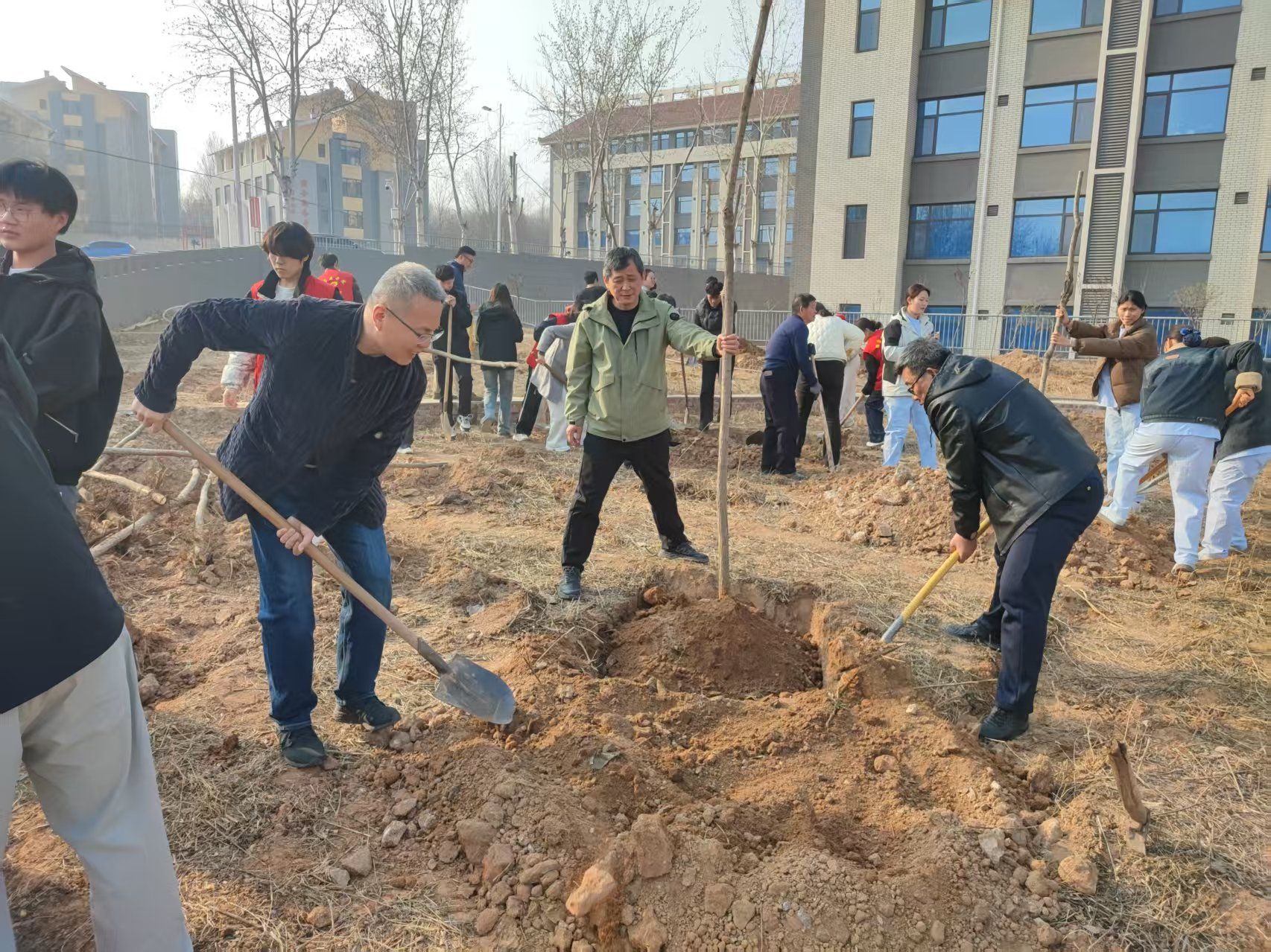 植树现场,师生们三两成组,分工协作。扶苗、铲土、填坑、踩实……每一个环节都认真细致,配合默契。经过近两个小时的辛勤劳动,一百多棵新栽下的树苗迎风挺立,为春日的校园增添了勃勃生机。
