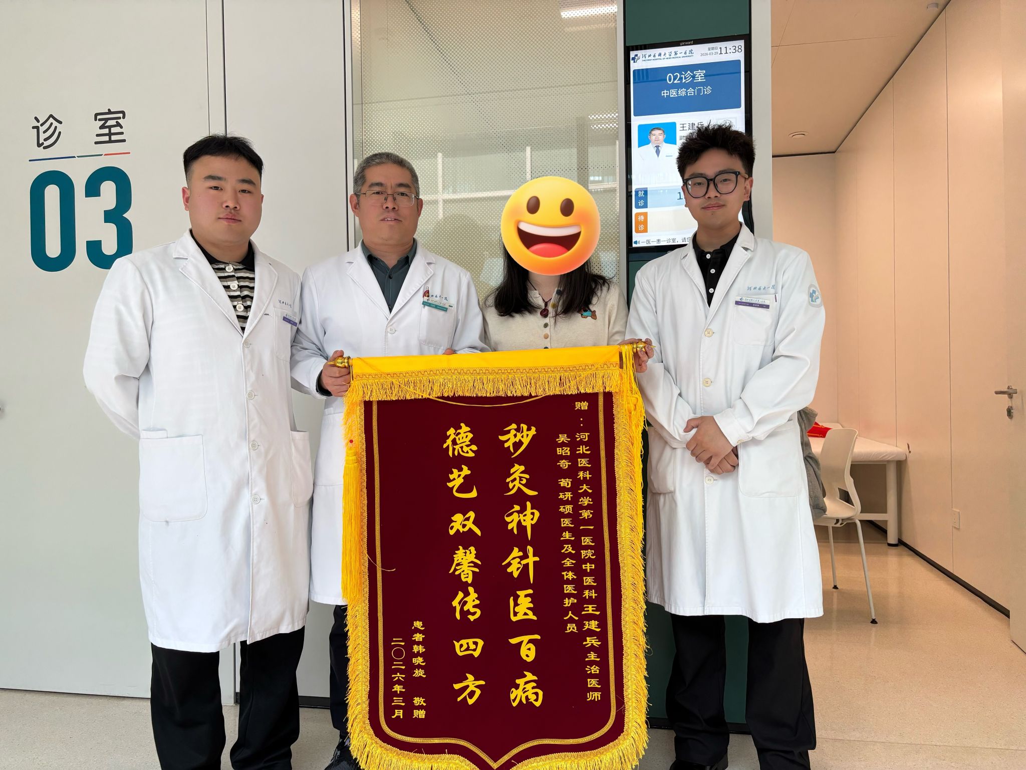 据悉,吴昭奇、荀研硕是我校中医系2023级中医学专业学生,现在河北医科大学第一医院中医科实习,两名同学在带教老师的指导下认真为韩女士进行艾灸、推拿等中医特色治疗,耐心细致地讲解康复训练方法与日常调护要点,有效缓解了患者颈部僵硬、腰腹疼痛的困扰,以专业的诊疗和温暖的服务赢得了患者好评,展现了邢医学子良好的专业素养。韩女士送来印有“妙灸神针医百病 德艺双馨传四方”的锦旗,向带教老师及两位同学致以诚挚谢意。