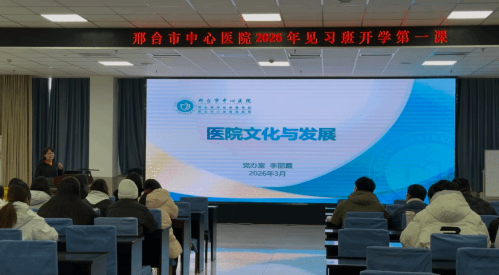 在学校附属医院(邢台市中心医院)见面会上,科教科冯丽老师对同学们的到来表示热烈欢迎,讲解了见习期间的班级纪律、课程安排以及注意事项,引导同学们规范行为、有序参与见习。随后,党办室李丽霞老师从医院发展、文化理念、服务宗旨等方面介绍了医院整体情况,帮助同学们快速熟悉医院、了解医院文化,为后续见习奠定基础。