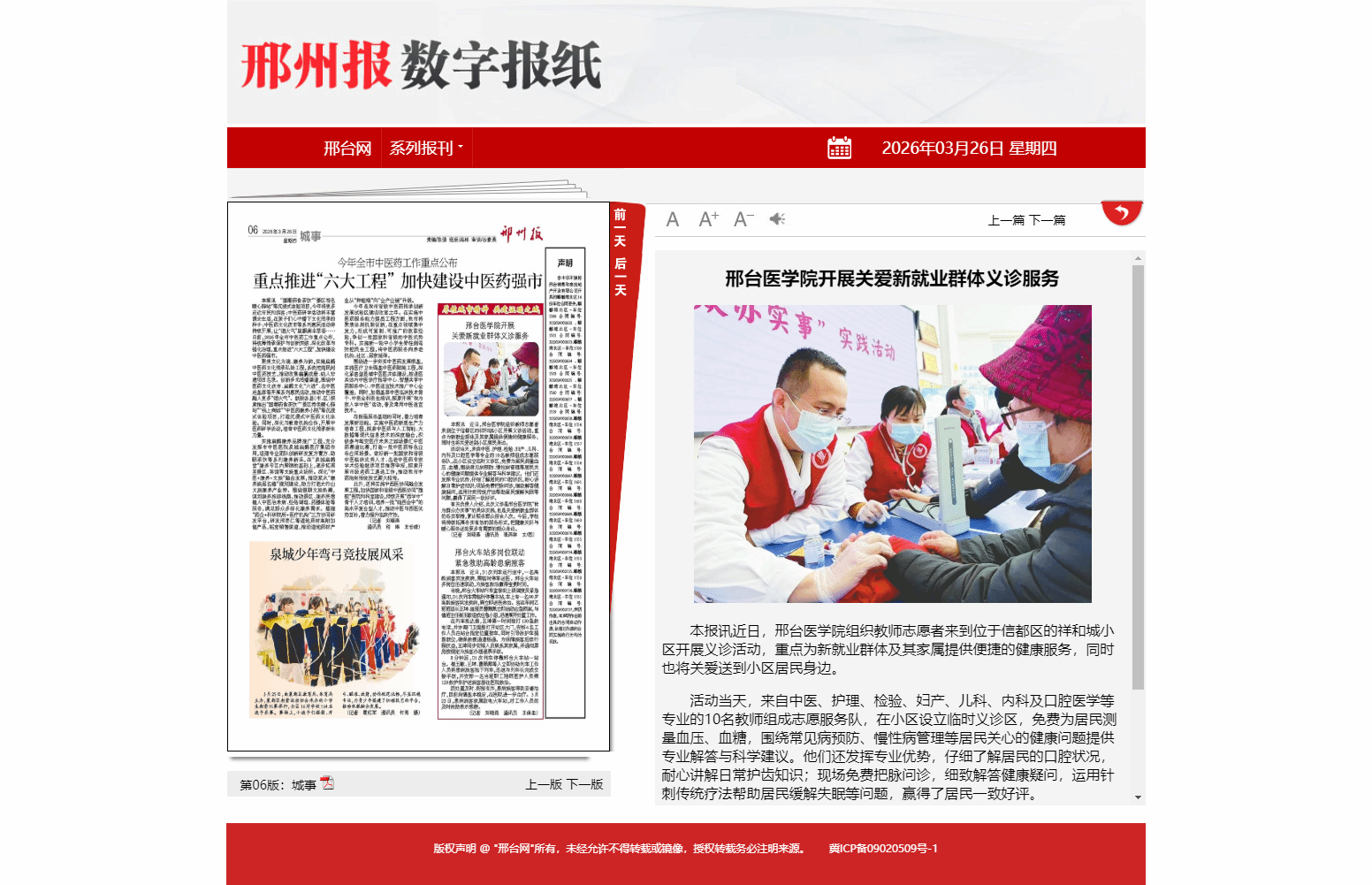 有关负责人介绍,此次义诊是邢台医学院“我为群众办实事”的具体实践,也是关爱新就业群体的务实举措,累计服务群众百余人次。今后,学校将持续拓展务实有效的服务形式,把健康关怀与暖心服务送到更多有需要的群众身边。